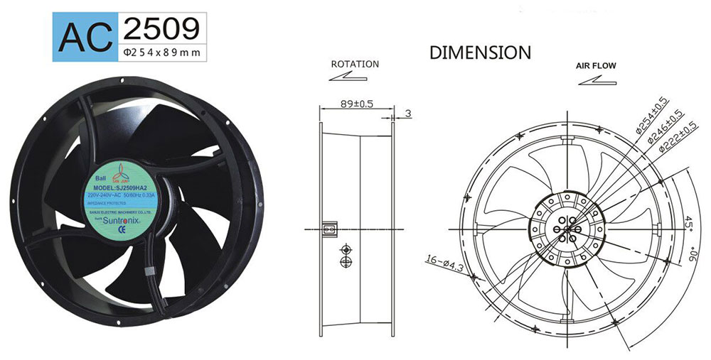 尺寸:254x89mm 框架:鋁ADC-12 軸承:雙滾珠軸承 電壓:AC 110V 220V 380V 壽命:60 000Hours at 20℃--滾珠軸承 工作溫度:-20℃~70℃ 正常濕度 儲存溫度:-20℃~85℃ 正常濕度